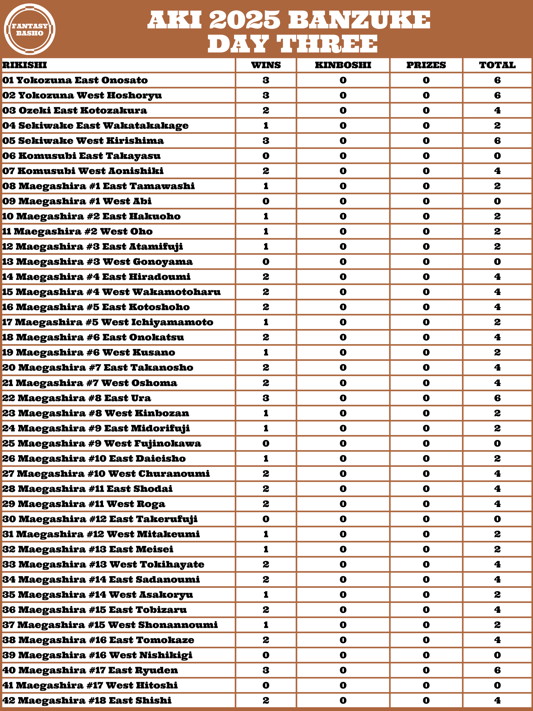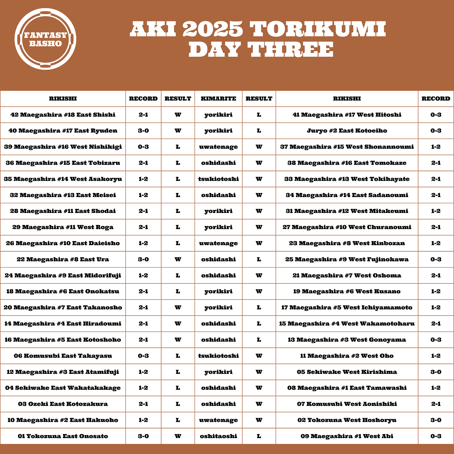Of course, with 12 matches remaining, no one is really out of the race just yet. Even the five competing rikishi at 0-3 (Takayasu, Abi, Gonoyama, Fujinokawa, Nishikigi, and Hitoshi) still can make up ground in theory. Even Wakatakakage’s Ozeki run isn’t dead despite a 1-2 record, but he does need at least 10 wins in the next 12 days or better. That’s possible, but it’s much tougher when the Yokozuna are performing so well.