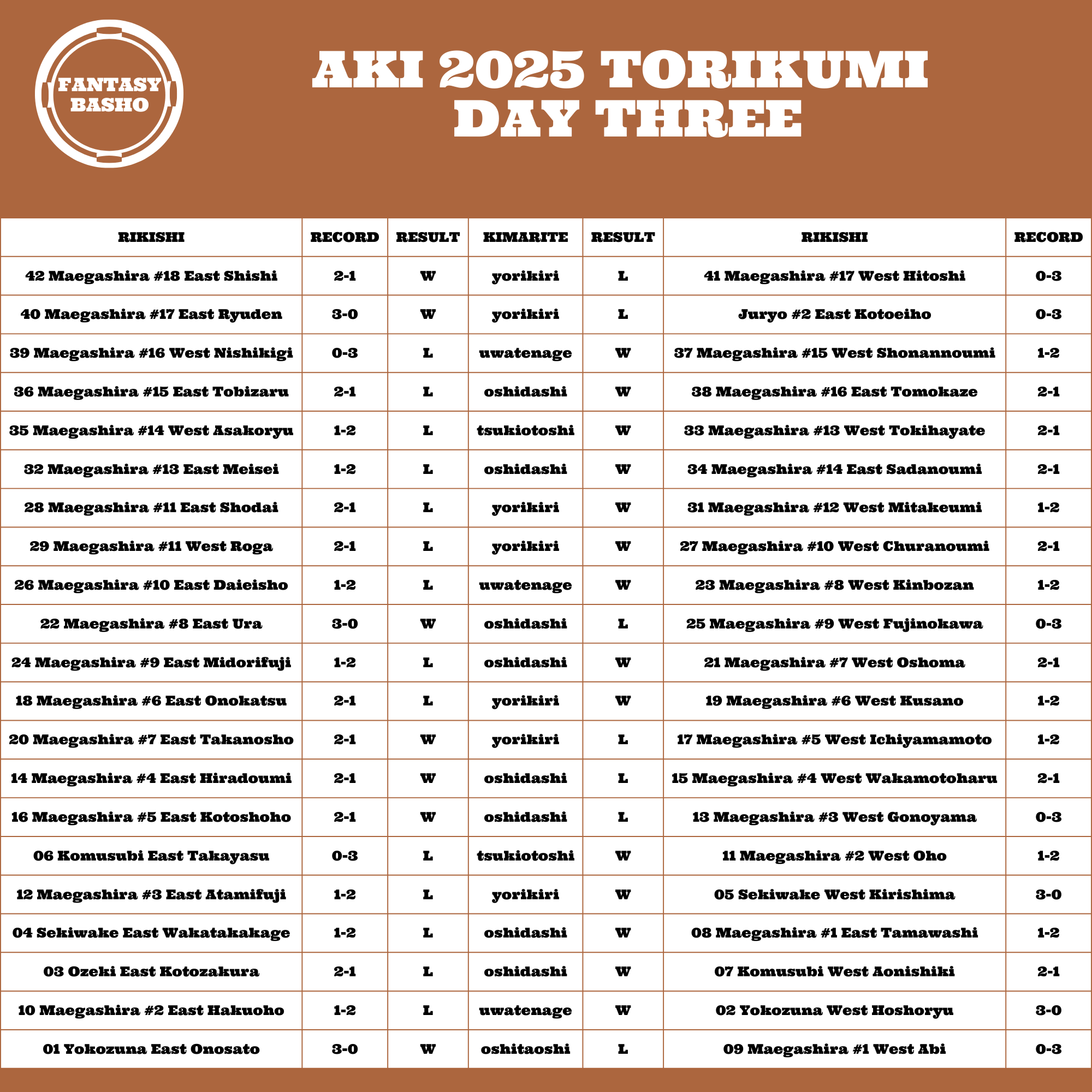 Onosato and Hoshoryu held serve on Day Three. Onosato pushed back on Abi’s tsuppari attack for an easy win. After that match, there’s now an open question about how casually someone can shove another man clear off the dohyo. Hoshoryu’s match was a little more complicated, since he went sideways rather than head on. He also beat Hakuoho decisively with an impressive throw.