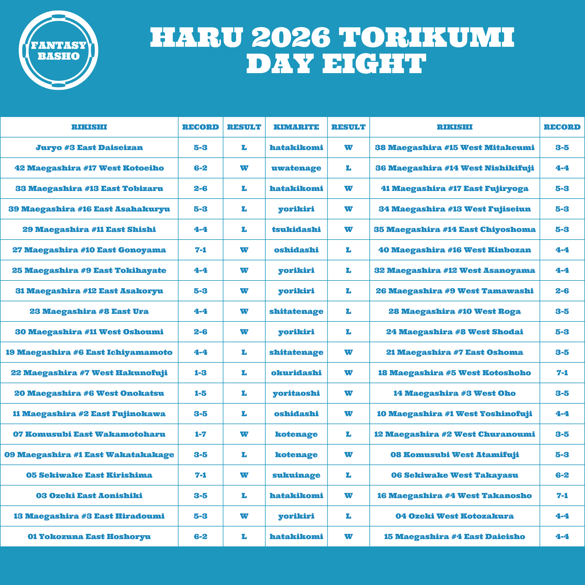 Daieisho slapped down Hoshoryu with force. Takanosho suitably unbalanced Aonishiki. Kirishima outlasted Takayasu in what might be match of the basho. Kotoshoho swatted aside an awkward Hakunofuji. Gonoyama continued his bulldozer impression against Kinbozan. Kotoeiho began the day’s throw fest with an uwatenage against Nishikifuji.
