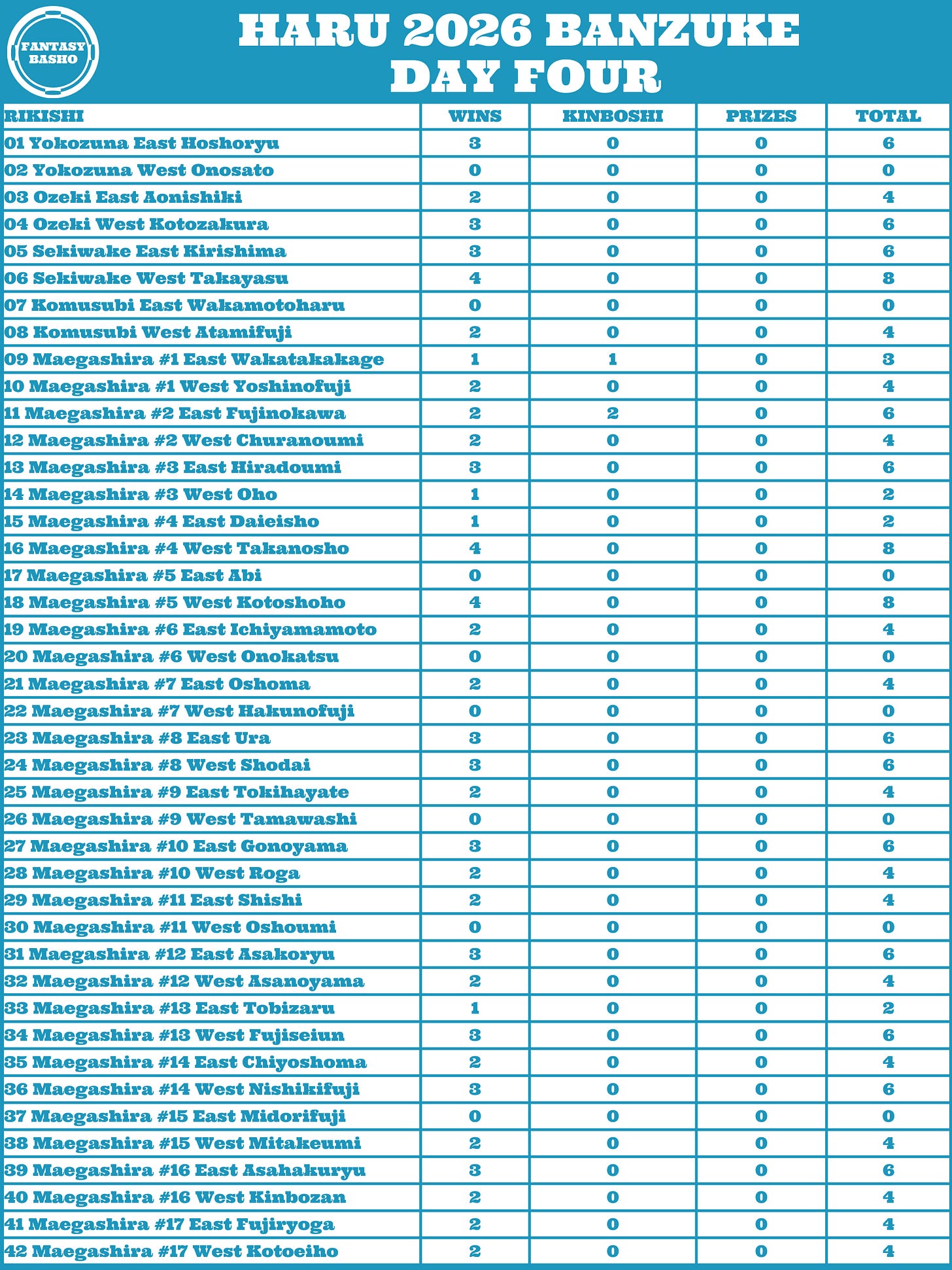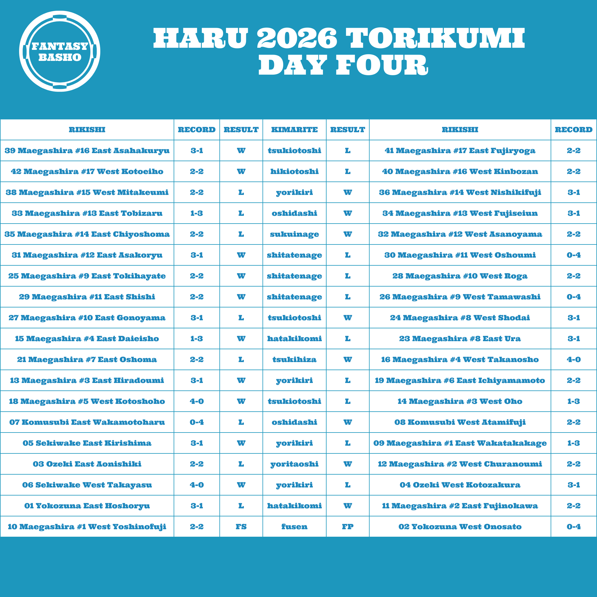 Haru does seem like it is bound to produce more surprises. Onosato is out officially with his left shoulder injury after losing his first three matches. Every sanyaku man’s remaining schedule just shifted, plus the only Sanyaku man at 4-0 is Takayasu. As a sekiwake, he will likely get the other Sanyaku rikishi sooner rather than later. Similarly, Takanosho and Kotoshoho will square off before the middle weekend, since they have one rank between them. An opening for anyone off the pace should be there before too long.