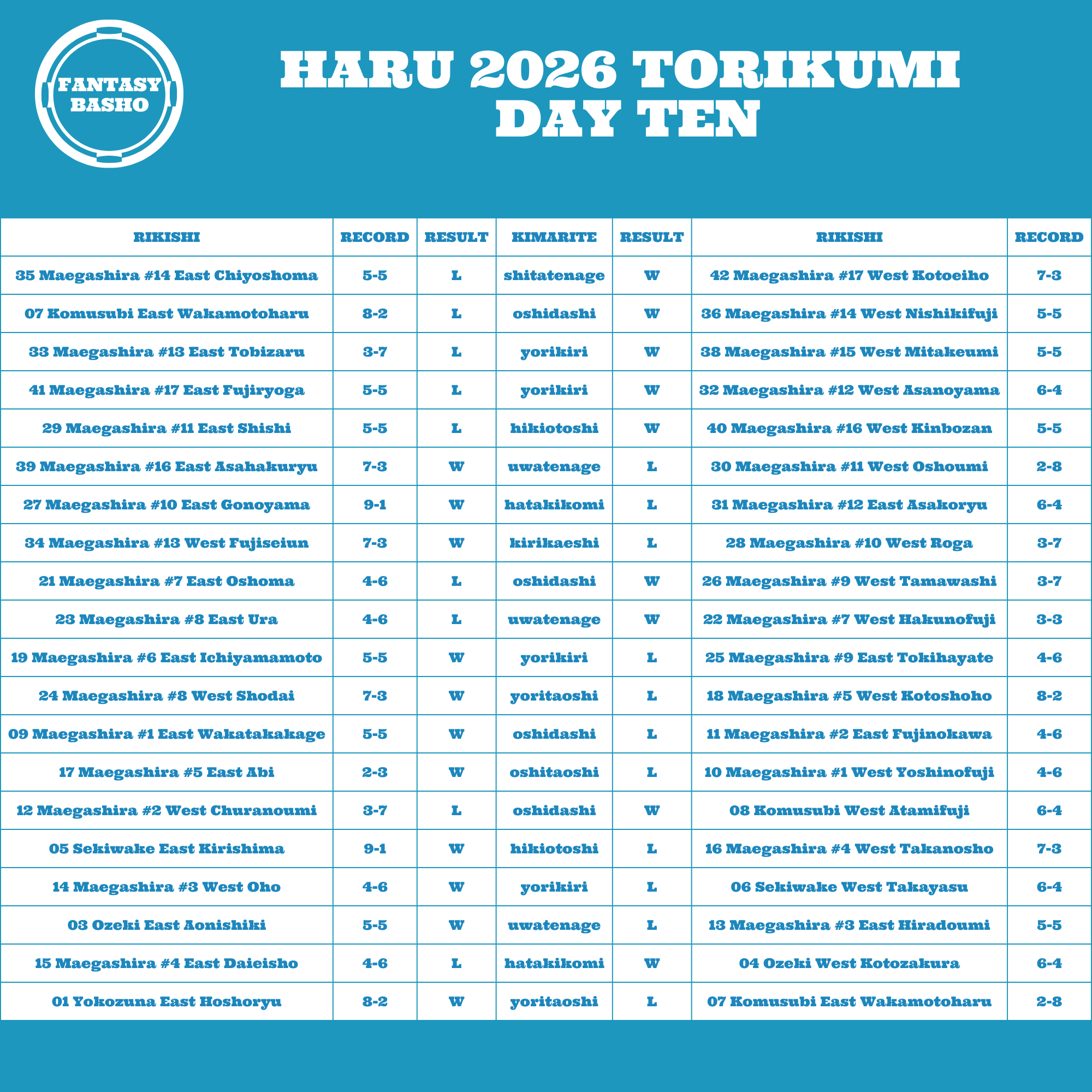 Kirishima, Gonoyama, and Hoshoryu kept up with winning ways on Day Ten. Kirishima and Gonoyama remain atop the leaderboard with 9 Wins. Hoshoryu sits one loss behind alongside Kotoshoho, who lost against Shodai. None of their matches were the most compelling sumo on the day, but their matches will matter the most for the next few days.
